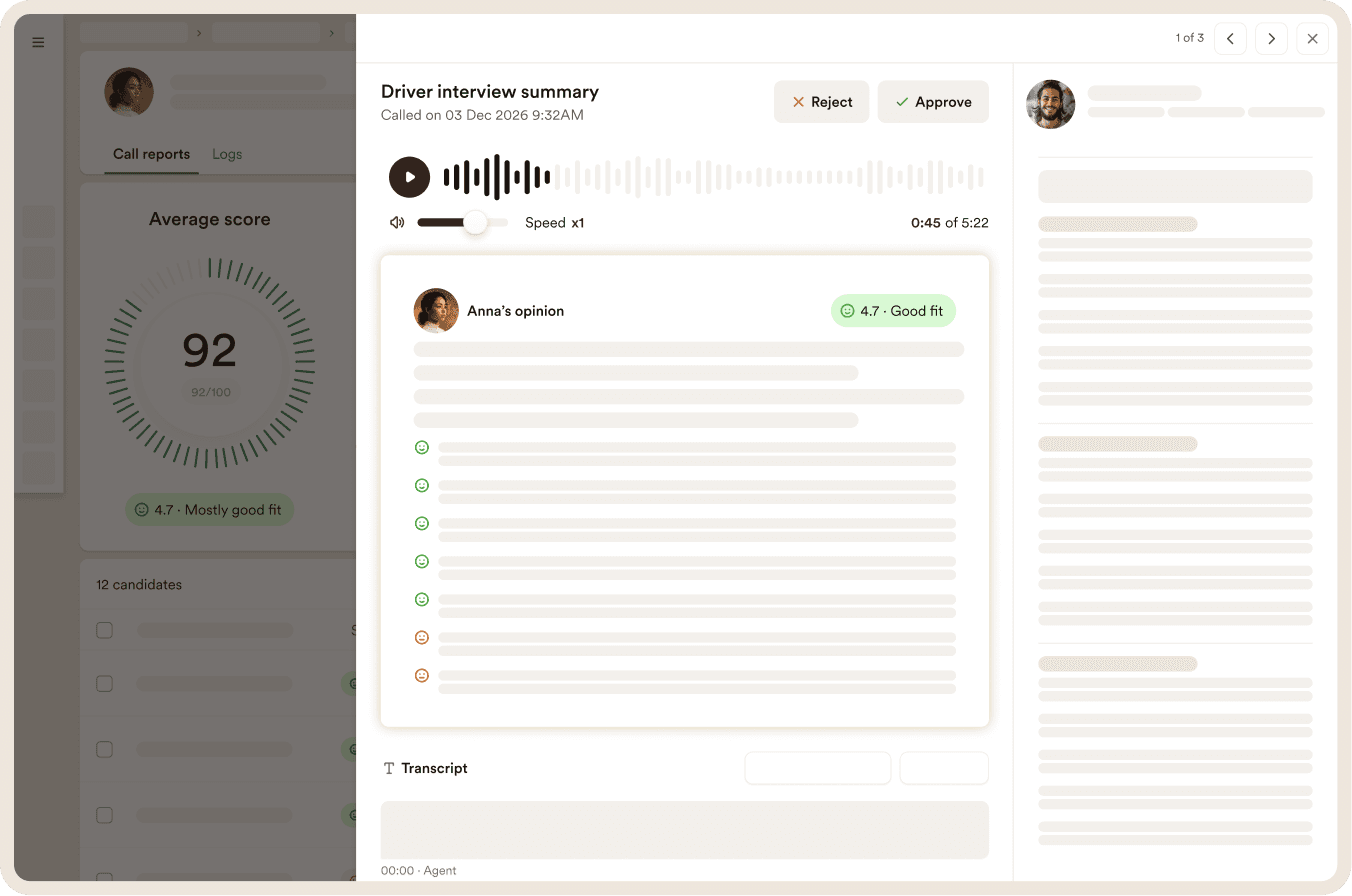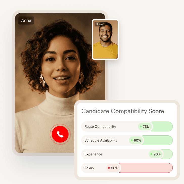 I’m a voice agent built for hiring drivers. I take care of your prescreening interviews, and turn conversations into clear, decision-ready insight.